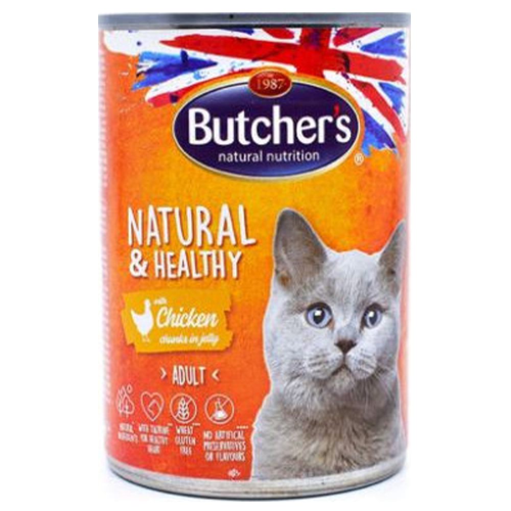 هو طعام قطط فاتح للشهية ، محضر من مكونات طبيعية ، غني بالتوراين لصحة القلب ، نعلم جميعًا مدى صعوبة إرضاء القطط عندما يتعلق الأمر بالوجبات. نعتني بالصغار .نستخدم معرفتنا وخبرتنا في مجال إنتاج الأعلاف الحيوانية ، ولهذا السبب قمنا بإعداد وجبات لذيذة ستحبها قطتك. يلبي محتوى اللحوم العالي في العلف الاحتياجات الغذائية الطبيعية للخرخرة. يجعل قلة الحبوب الNO مصدرًا صحيًا وكاملاً للعناصر الغذائية لحيوانك الأليف. تعد قطع اللحم اللذيذة المغموسة في هلام عطري طعامًا شهيًا لا يمكن أن تقاومه نفخة! سوف يوفر الجزارون الطبيعي والصحي لمحبوبتك تجربة طعم فريدة من نوعها. بفضل التبخير ، يحتفظ الطعام بالعناصر الغذائية القيمة والنكهة الطبيعيةis an appetizing cat food, prepared from natural ingredients, enriched with taurine for a healthy heart.We all know how picky cats can be when it comes to meals. Caring for the little ones, we use our knowledge and experience in the field of animal feed production, that’s why we’ve created delicious meals that your cat will love.The high meat content of the feed satisfies the purr’s natural nutritional needs. Lack of cereals makes the product a healthy and complete source of nutrients for your pet.Pieces of tasty meat dipped in an aromatic jelly is a delicacy that no murmur can resist! Butchers Natural & Healthy will provide your pet with a unique taste experience. Thanks to steaming , the food retains valuable nutrients and a natural flavor.